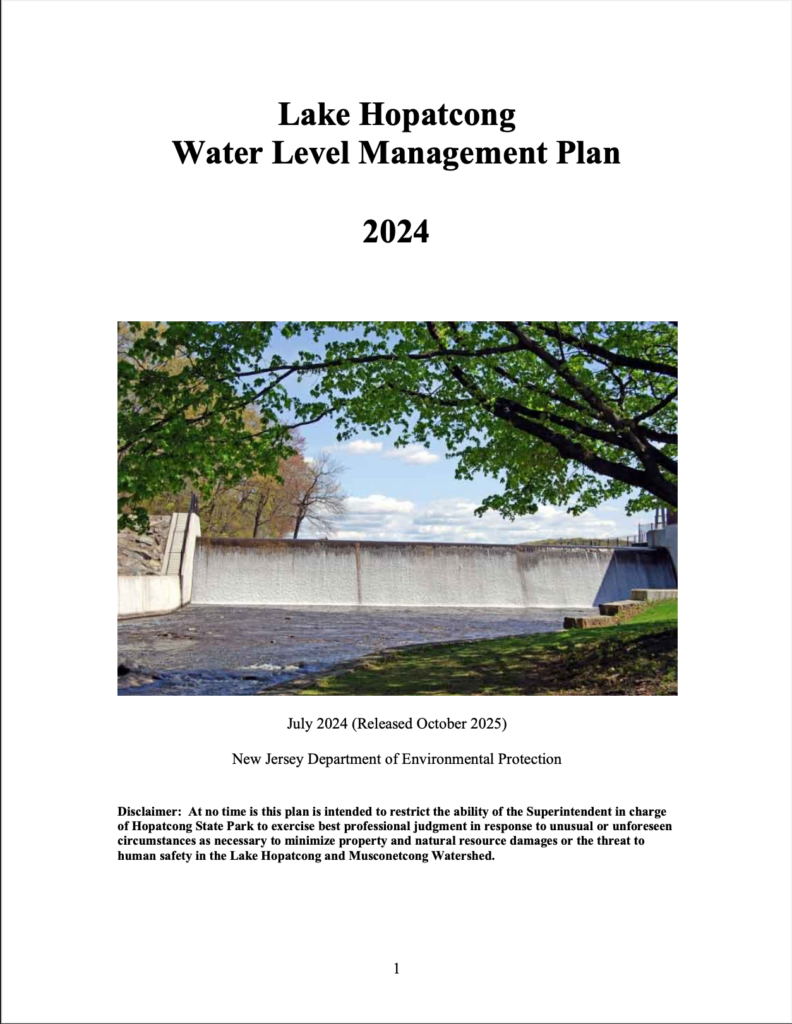 The New Jersey Department of Environmental Protection (NJDEP) released an updated Lake Hopatcong Water Level Management Plan (WLMP) . According to the NJDEP, the 2024 Lake Hopatcong Water Level Management Plan is a minor update to the 2011 Plan that reflects recommendations of the Citizen Advisory Committee made during meetings that occurred from 2021-2023. The purpose of the plan is to guide how lake levels are managed throughout the year and to balance recreation, property protection, dam safety, and downstream ecological needs.